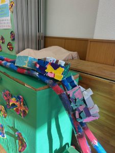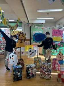 年少児は『おもちゃの国』をテーマに初めての廃材製作を楽しみました♪