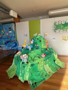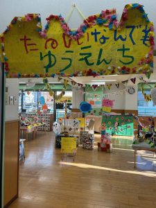 年中児はオリジナルの世界『ハッピージャンボリーパーク』をテーマに、1学期からその世界観で楽器遊びや運動会、表現遊びを楽しんできました。そこからつながり、今回は『たのしいなんでもゆうえんち』を作りました。