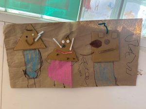 廃材を組み合わせて、見立てて、のりものやロボットを作ったり、食べ物やおうちを作る子もいました。