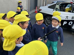 警棒も持たせてもらい、嬉しそうな子どもたち。重かったそうです。